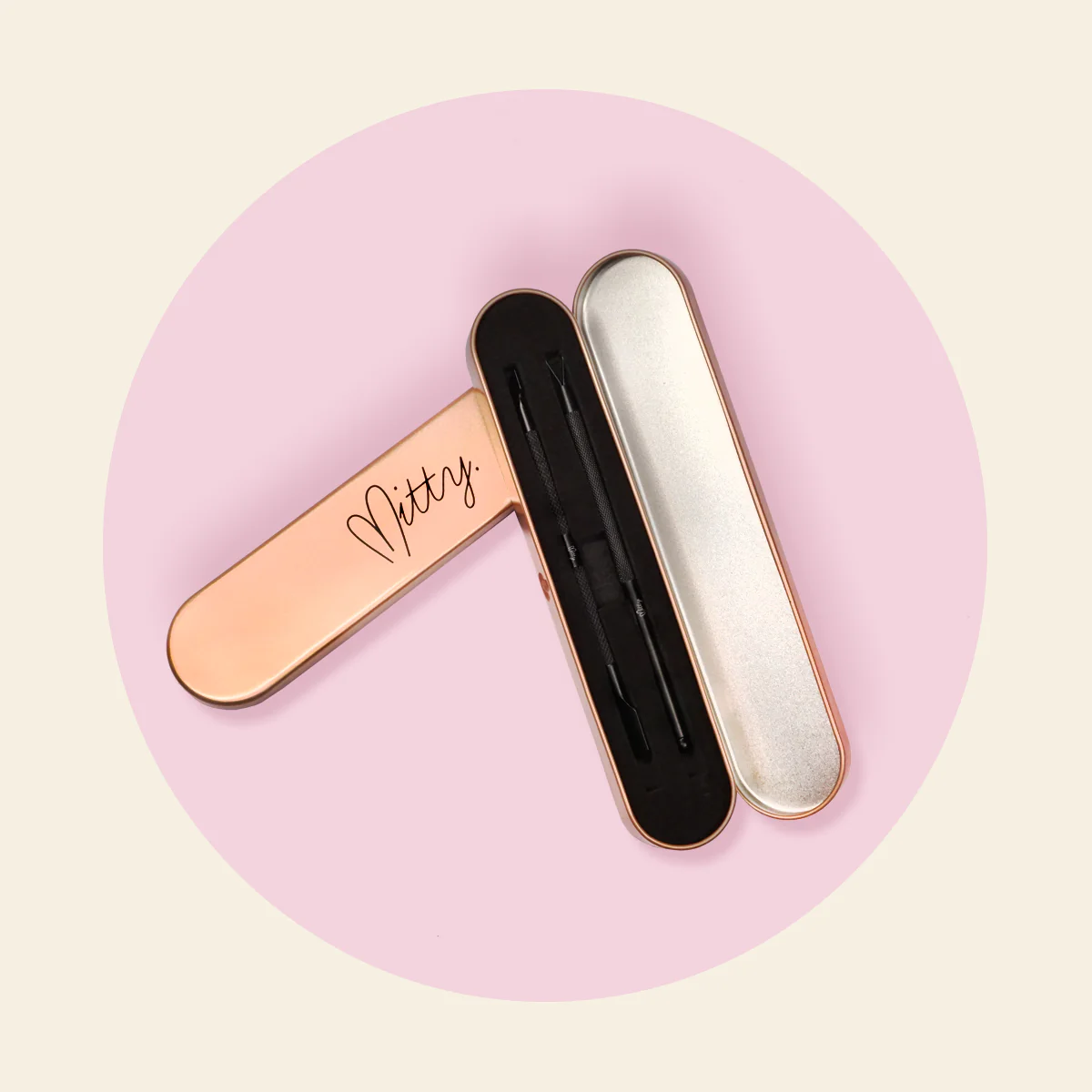 This gel polish scraper & cuticle pusher tool kit is a must have for nail care and easy gel removal. Made from 100% stainless steel, then powder coated matte black, and presented in a rose gold tin. Tested in real life salons @ Mitty Salon Brunswick & @ Mitty Salon Fitzroy. These tools will make the removal process so much easier.